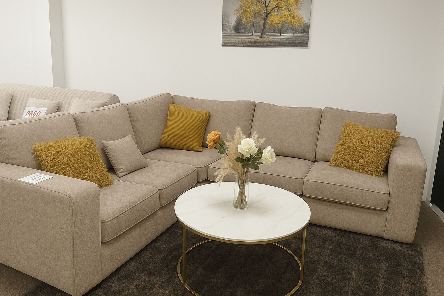 The Aleena sofa is a spacious five-seater measuring 235cm by 235cm in a stylish truffle shade, featuring durable chrome legs. Custom sizes are available upon request to perfectly suit your living space. It offers medium-firm, comfortable seating with washable cushions for both seats and backrests, combining practicality with quality craftsmanship. Contact us for bespoke sizing options tailored to your needs.