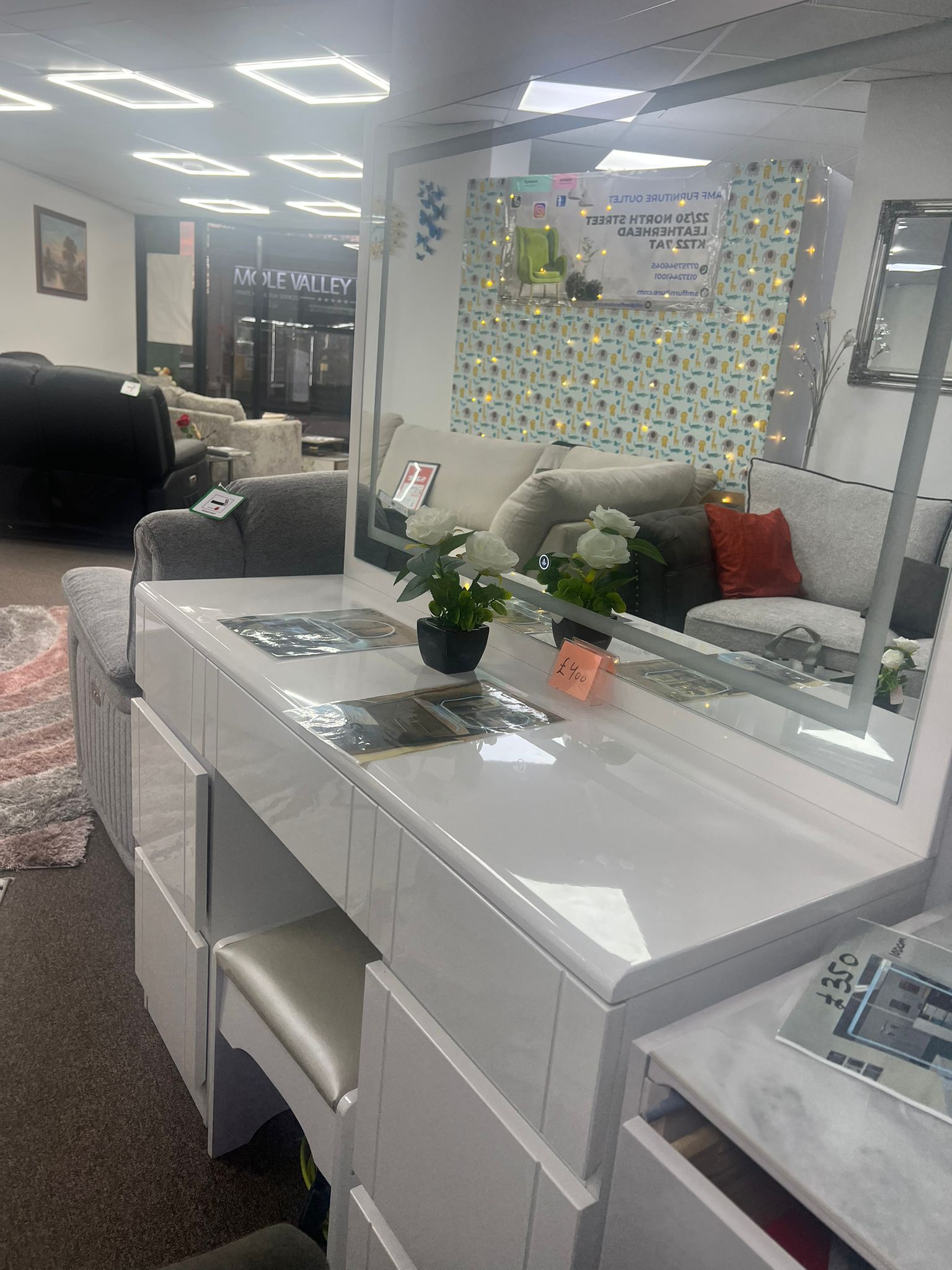 Elevate your bedroom with this high gloss dressing table, available in two practical sizes: 120 cm and 100 cm wide to suit different space requirements. Featuring a sleek, reflective surface, it enhances your room’s aesthetic while being easy to clean and maintain. The integrated touch light offers convenient illumination, perfect for applying makeup or grooming with precision. This set also includes a comfortable footstool, designed to complement the table’s modern style and provide added comfort during use. Ideal for adding both functionality and elegance to your personal space, this dressing table blends contemporary design with everyday practicality.