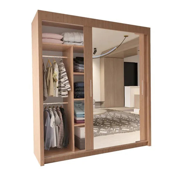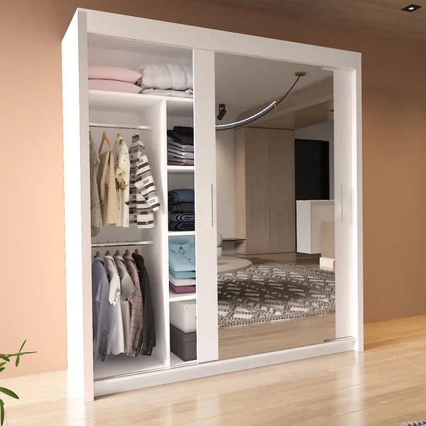 The Chicago full mirror 203cm wardrobe boasts a sleek, modern design that maximizes storage space for larger rooms or households with extensive storage needs. It features a spacious interior with a large hanging section, multiple shelves, and dedicated space for shoes, bags, and other essentials. With a width of 203cm, it's perfect for master bedrooms or shared wardrobes. Built with premium materials, it offers long-lasting durability and stability. The sophisticated design, complete with clean lines and a neutral finish, effortlessly blends into any interior style. Its dimensions are 203cm in width, 216cm in height, and 62cm in depth. Elevate your home with the 203cm Chicago wardrobe, the perfect combination of style and function for all your storage needs. Note: Ground floor delivery is provided, but for upper floors without a lift, additional charges may apply. Please contact our team for more information.