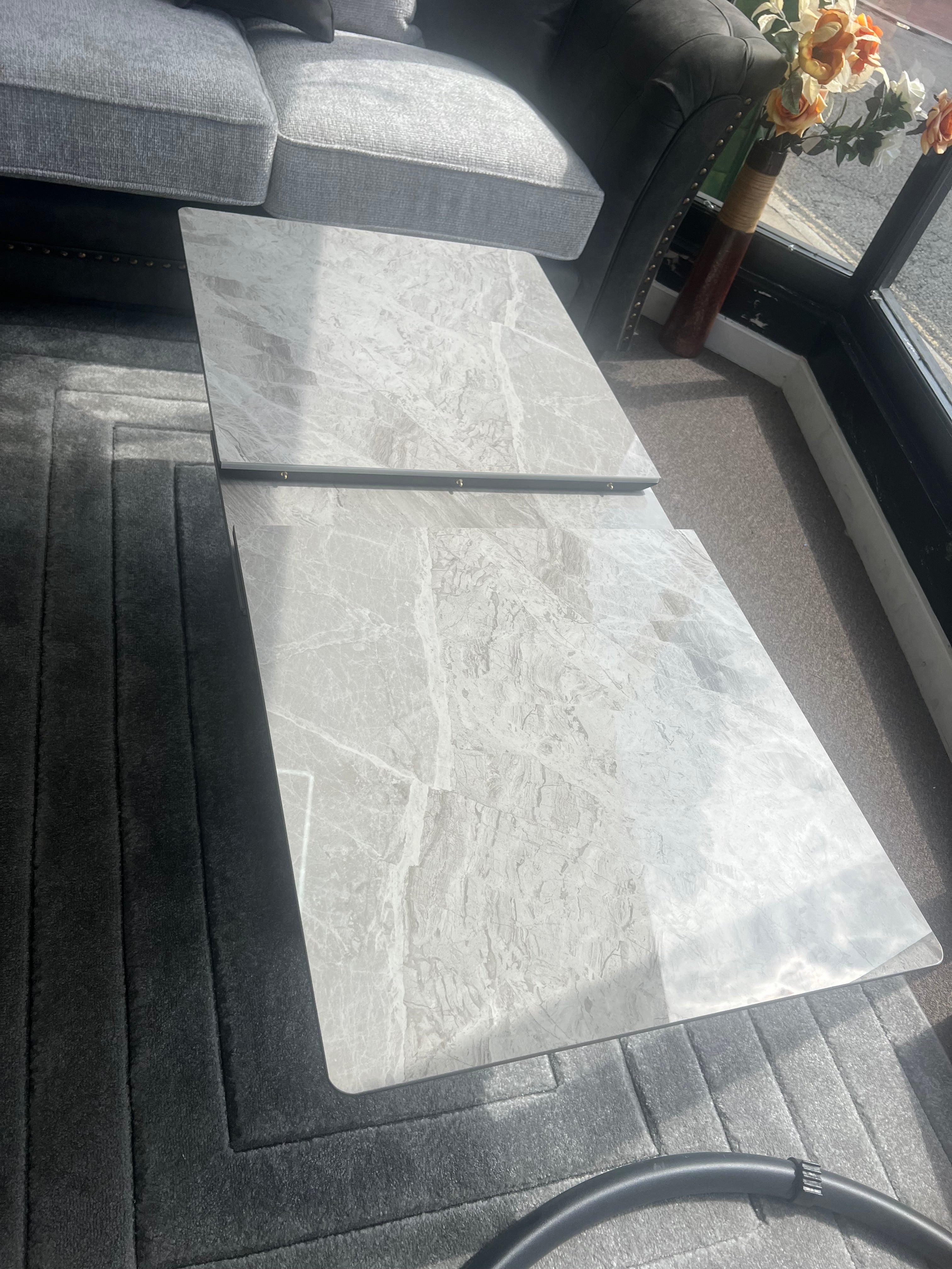 Upgrade your living space with our Extendable Dining Table. Crafted with a marble bottom and solid wood frame, this coffee table top extends for added functionality and elegance. Perfect for entertaining, dining, or simply adding a touch of sophistication to your lounge.