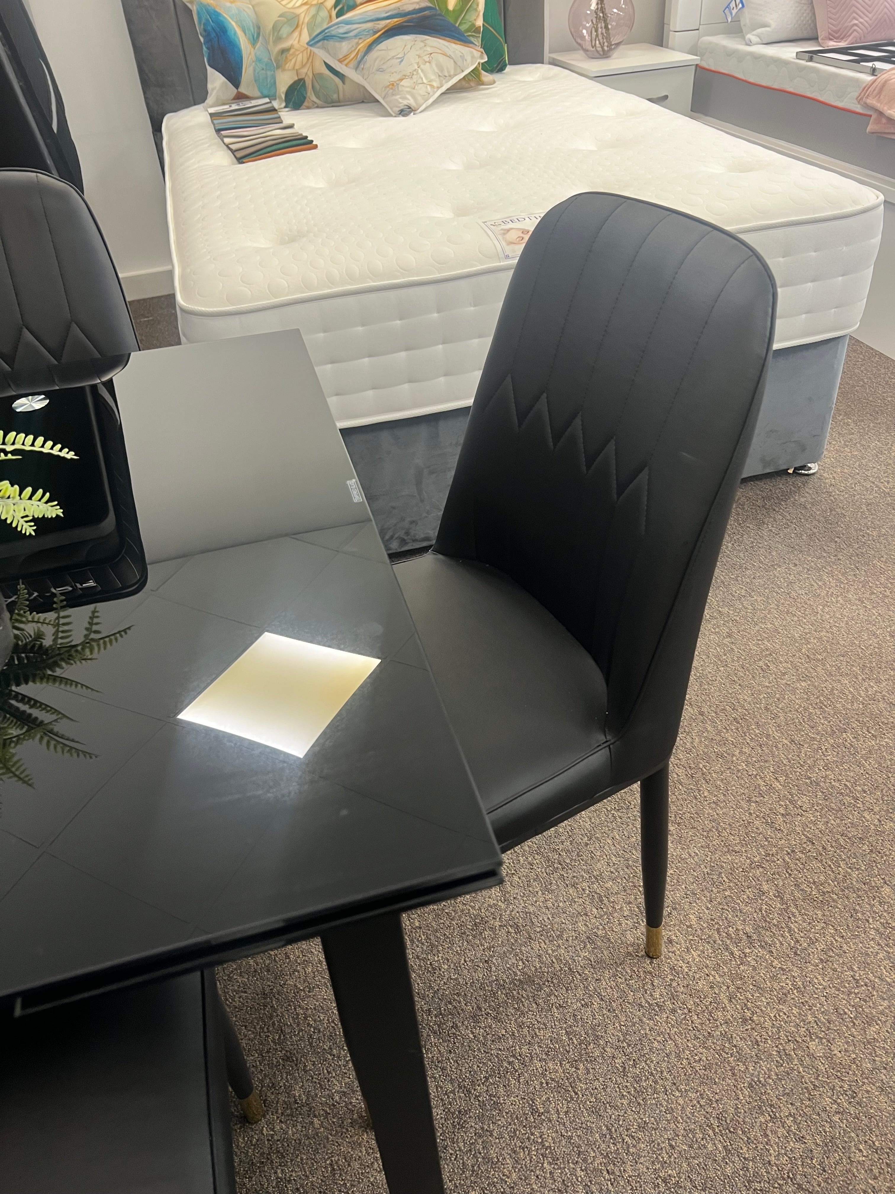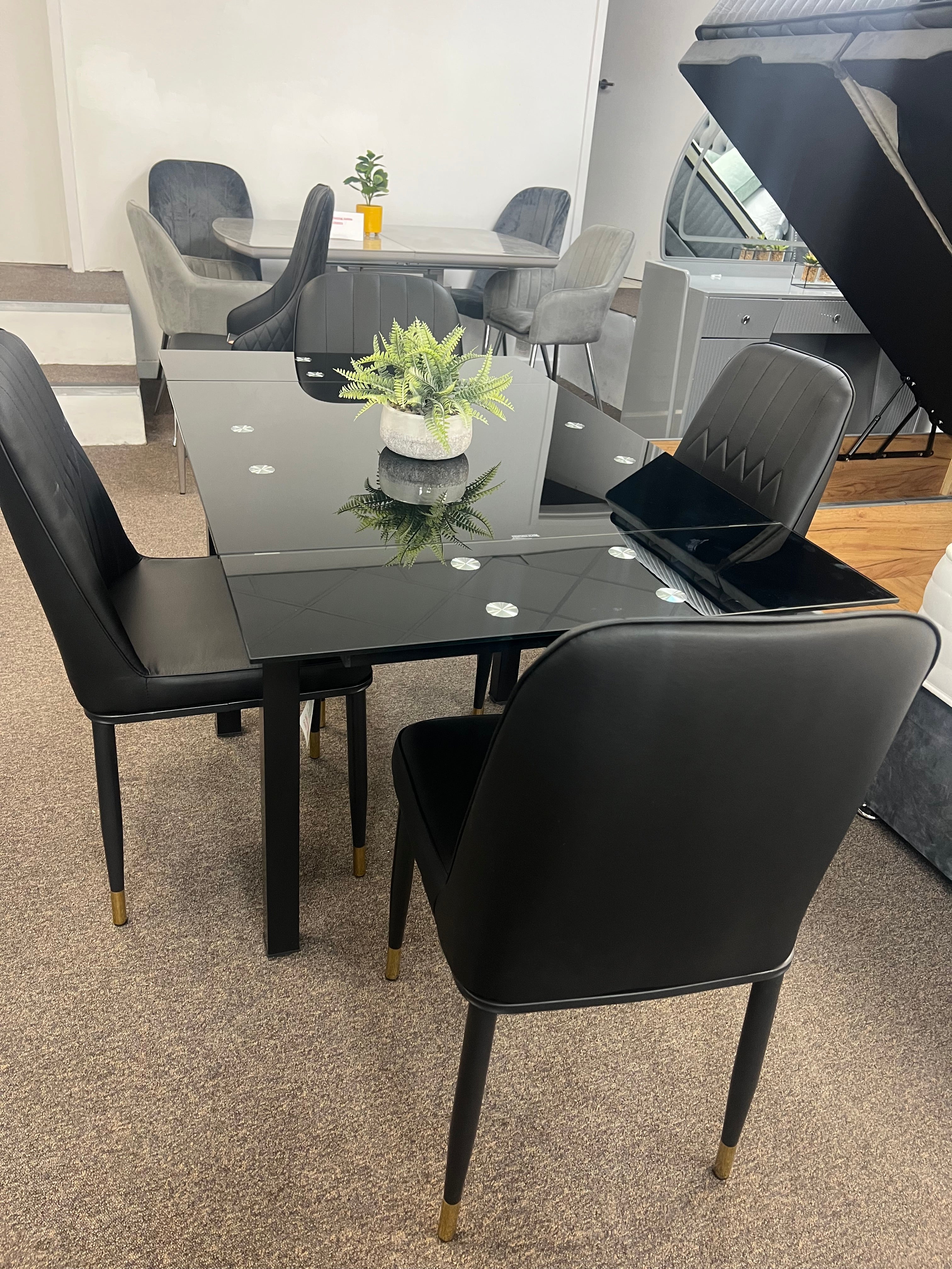 Glass dining table with four leather comfortable chair This glass extendable dining table comes with four leather chairs and the ability to extend to fit up to six chairs. Made with quality materials, it provides both comfort and functionality for your dining needs. Enjoy luxurious dining experiences with this stylish and versatile set.