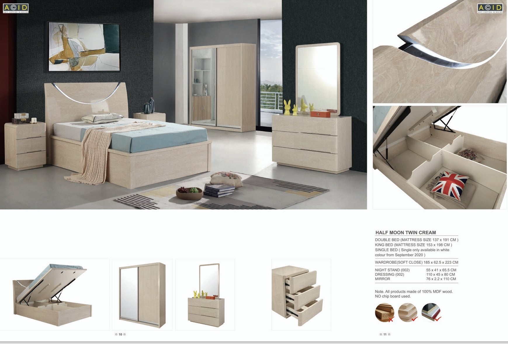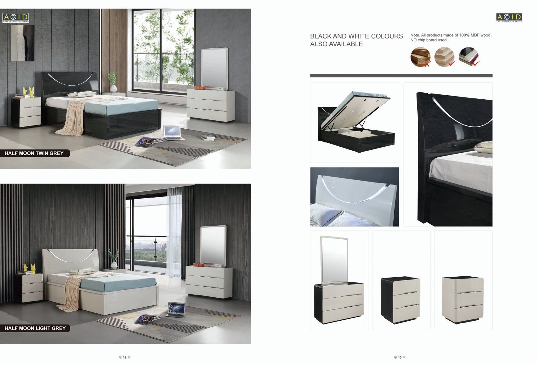This Half Moon High Gloss Bedroom Set is the perfect addition to any bedroom. The set includes a bed frame made of wood or 100% MDF wood .The set is available in Cream,Grey and twin grey black, and cream colours, making it a versatile option for any decor.The bedroom set is designed for adults and is suitable for any bedroom room. The glossy finish adds a touch of elegance to the set, making it a great addition to any home. The set is made of high-quality materials, ensuring durability and longevity.