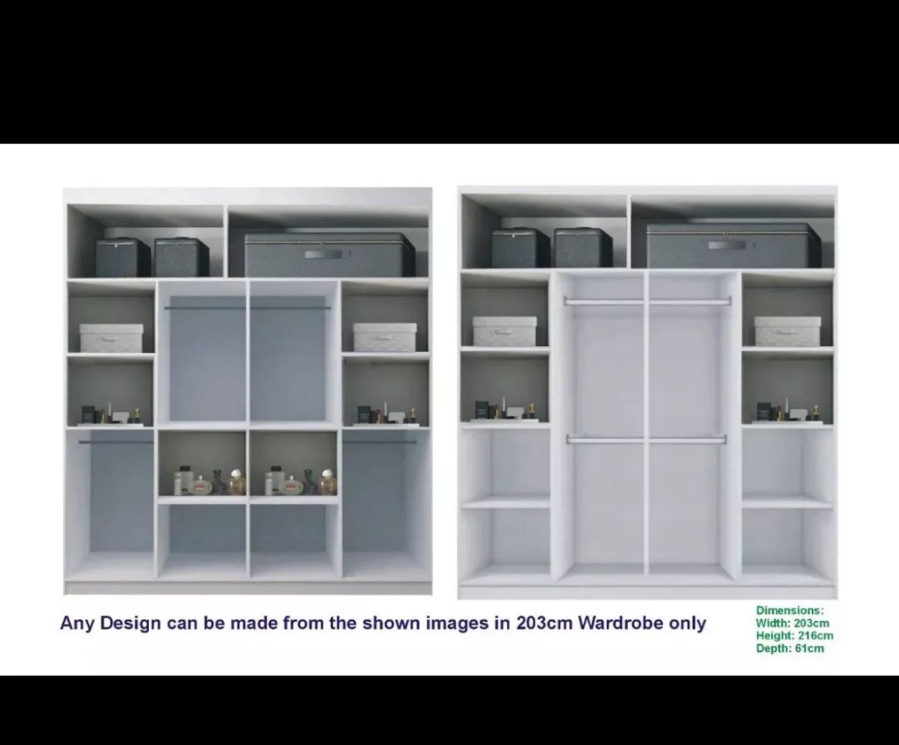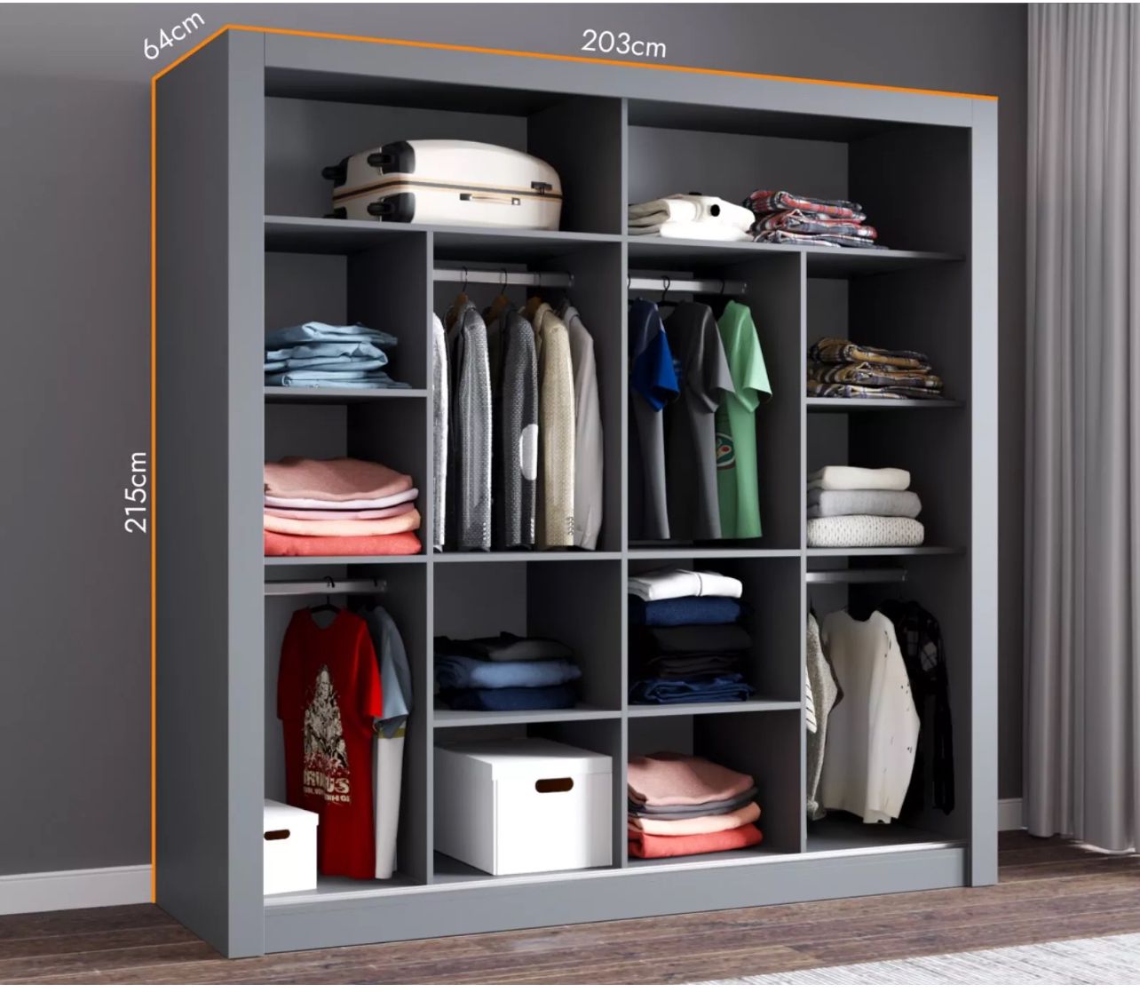 The LISBON Sliding Door Wardrobe epitomizes luxurious living and is the ultimate package with a price tag affordable for most! The full-length mirror on this wardrobe not only adds light to your bedroom but creates the illusion of enlarged bedroom space. The elegant horizontal panelled door further adds to this wardrobe’s beauty and also creates a calm, tranquil aura – perfect when you want your bedroom as a place where you can escape the hassle and bustle of the day! The Lisbon Sliding Wardrobe is equivalent to 4 single wardrobes. It boasts 8 huge cubed storage compartments, plus another 2 suitcase-size shelves on top. So there’s more than enough room for all your clothes, as well as bedding, boots, and storage boxes in the largest size (203cm). Features; 10 shelves, 4 hanging rails, 2 sliding doors