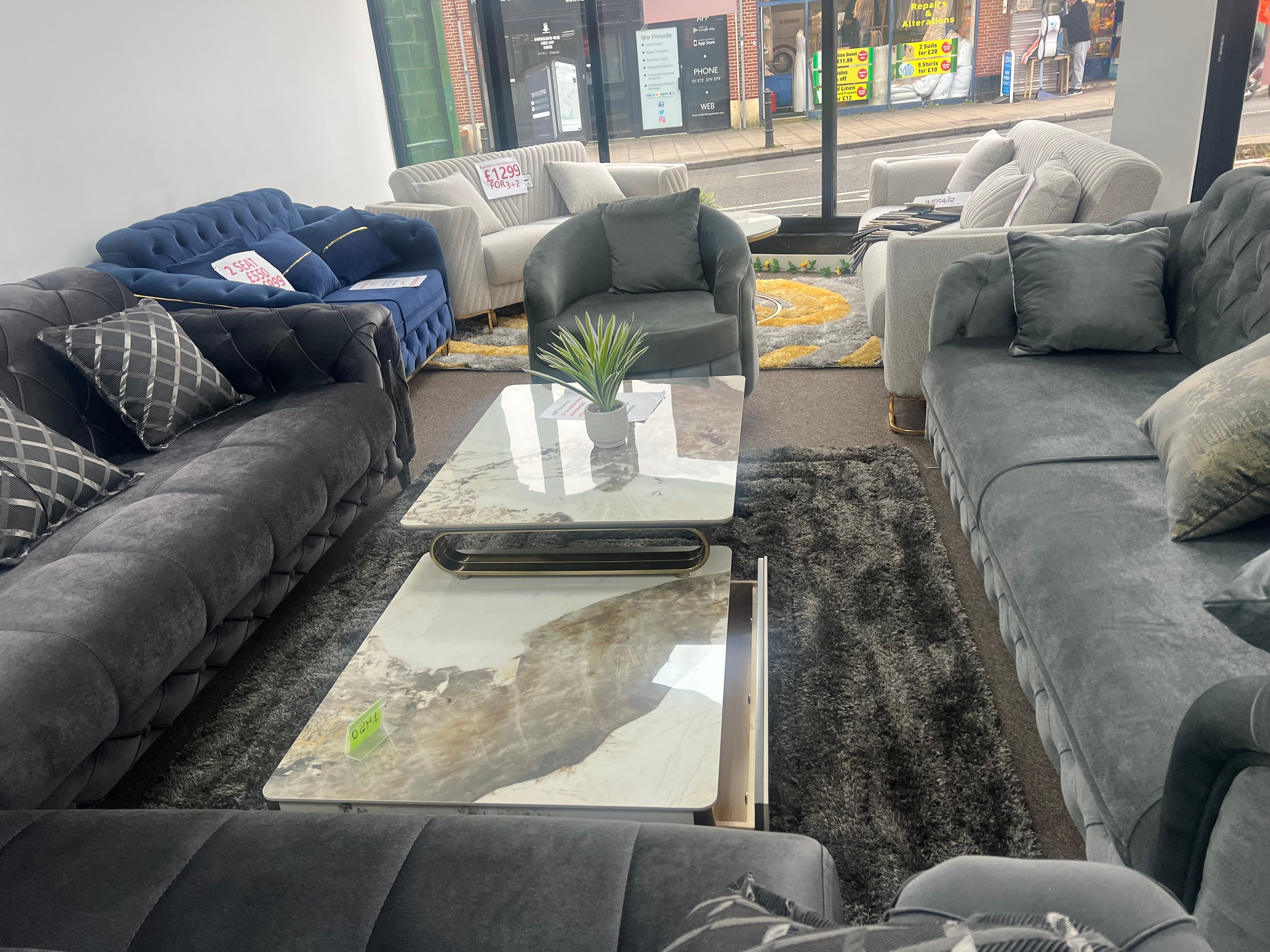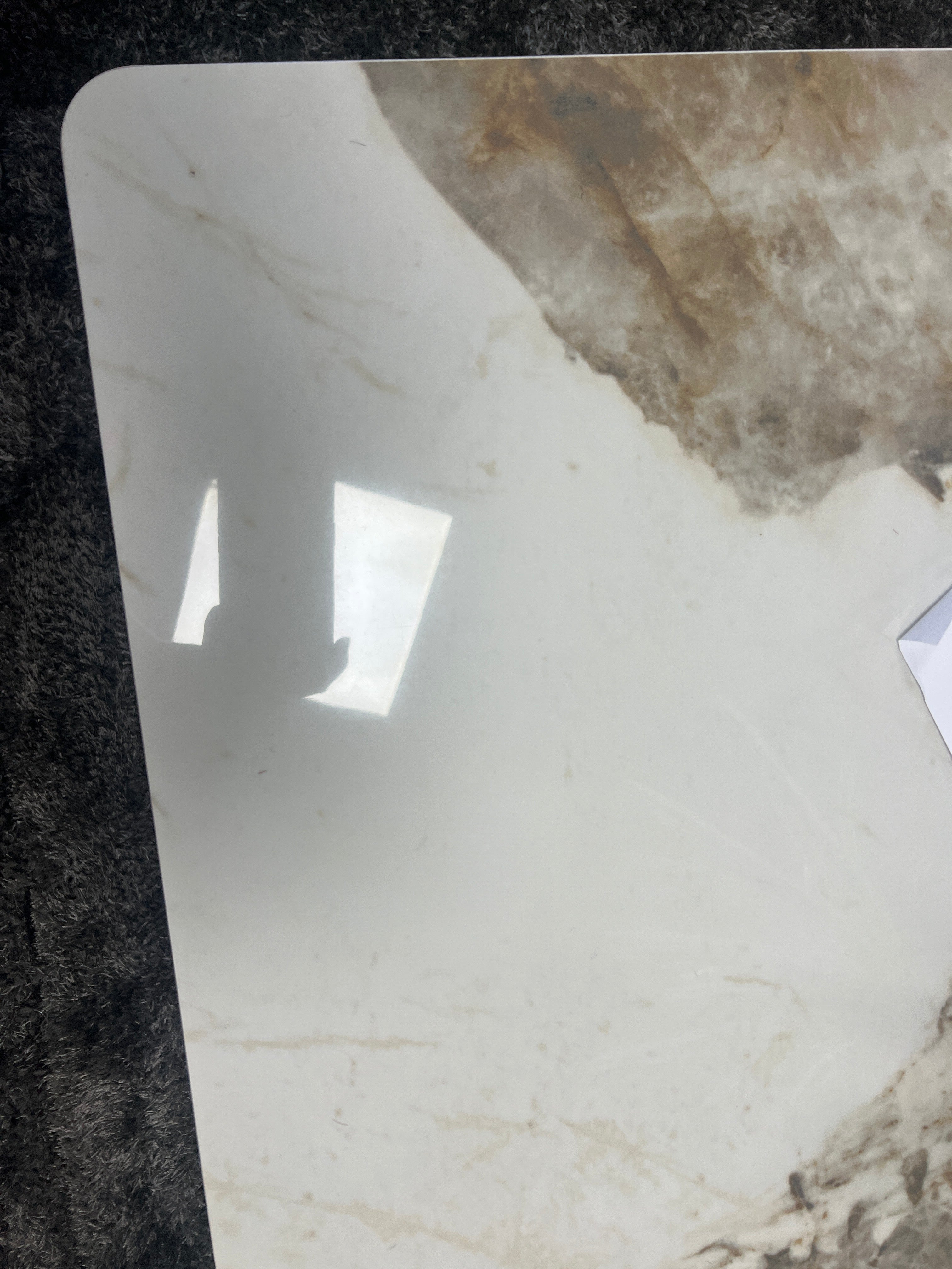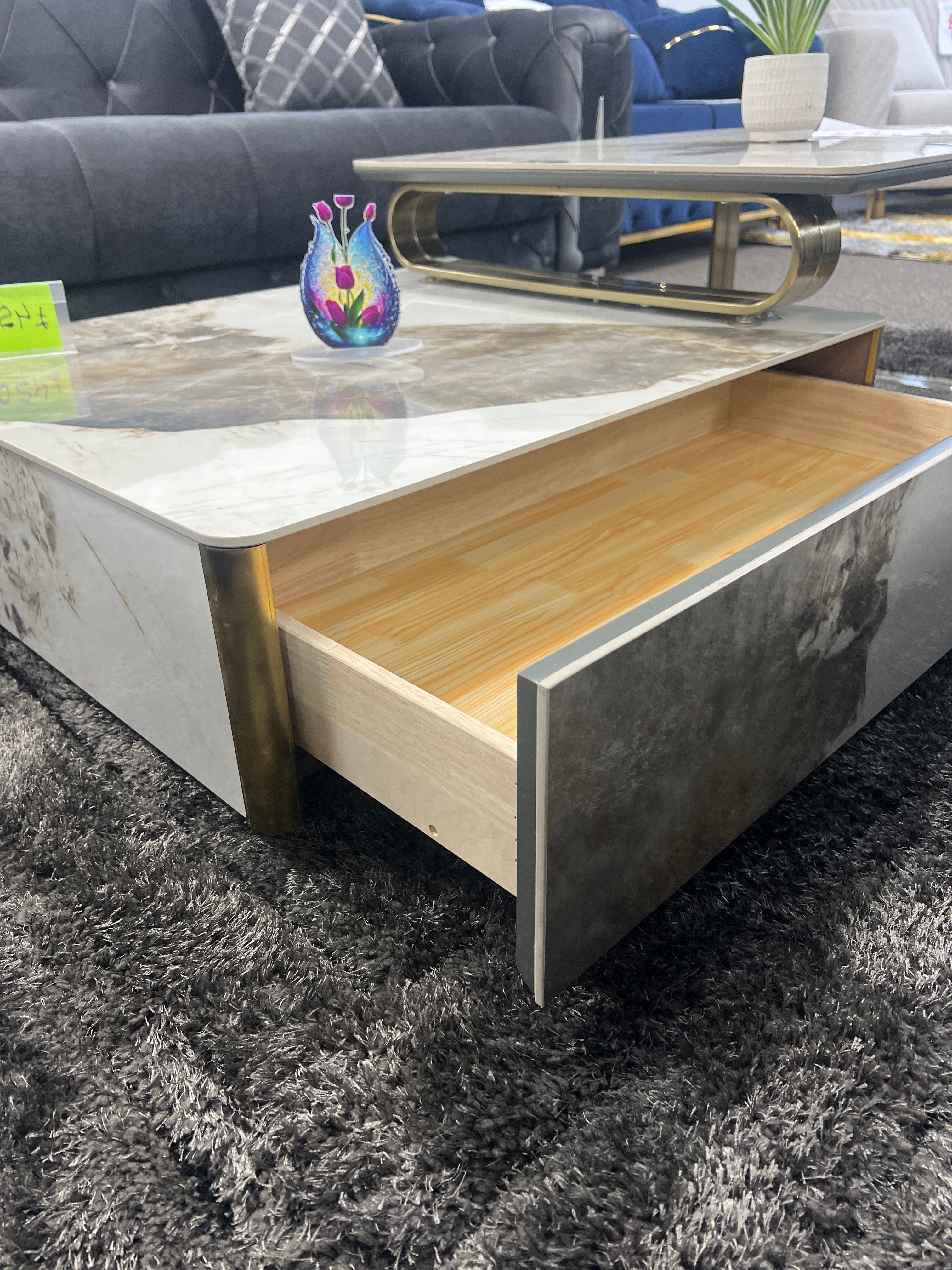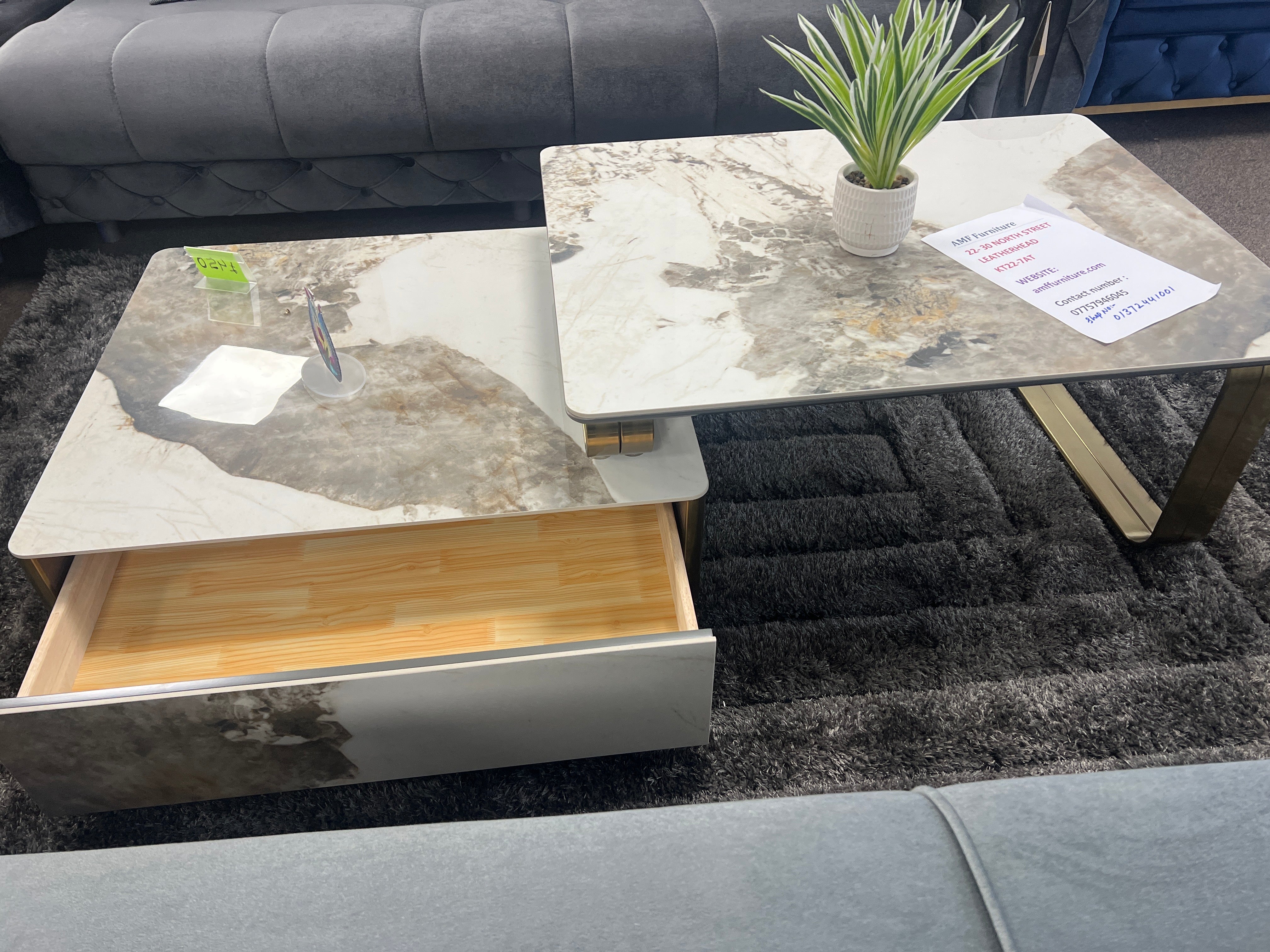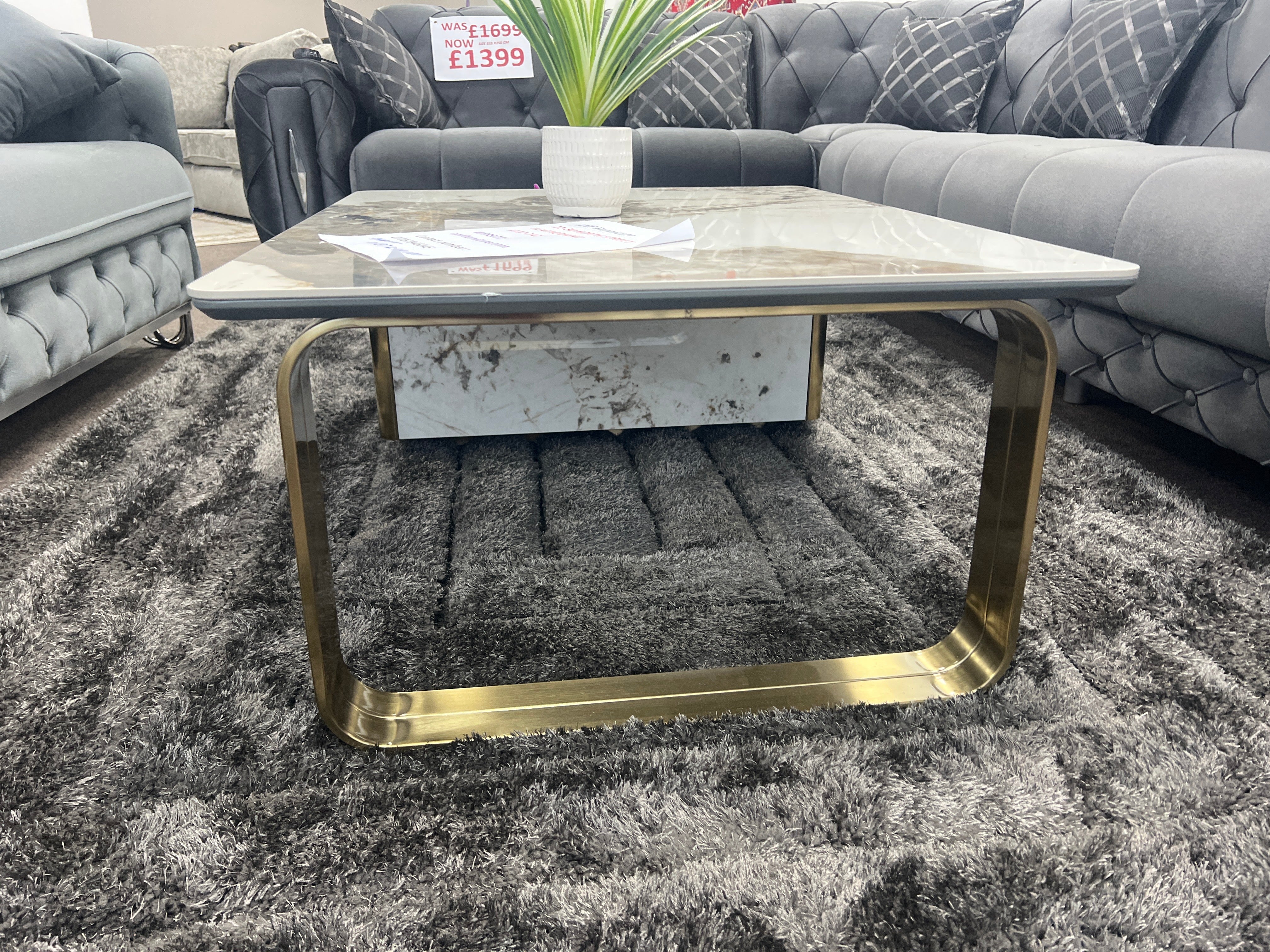 colour grey brownish and cream with gold legs Upgrade your living space with this sleek and functional coffee table. Measuring 5ft in length and 2ft 4inches in width, it offers ample space for displaying your decor or storing your belongings. The modern design features a sophisticated grey, brownish, and cream color scheme, accented by elegant gold legs that add a touch of luxury. Enhance your interior with this stunning addition that combines style and versatility.