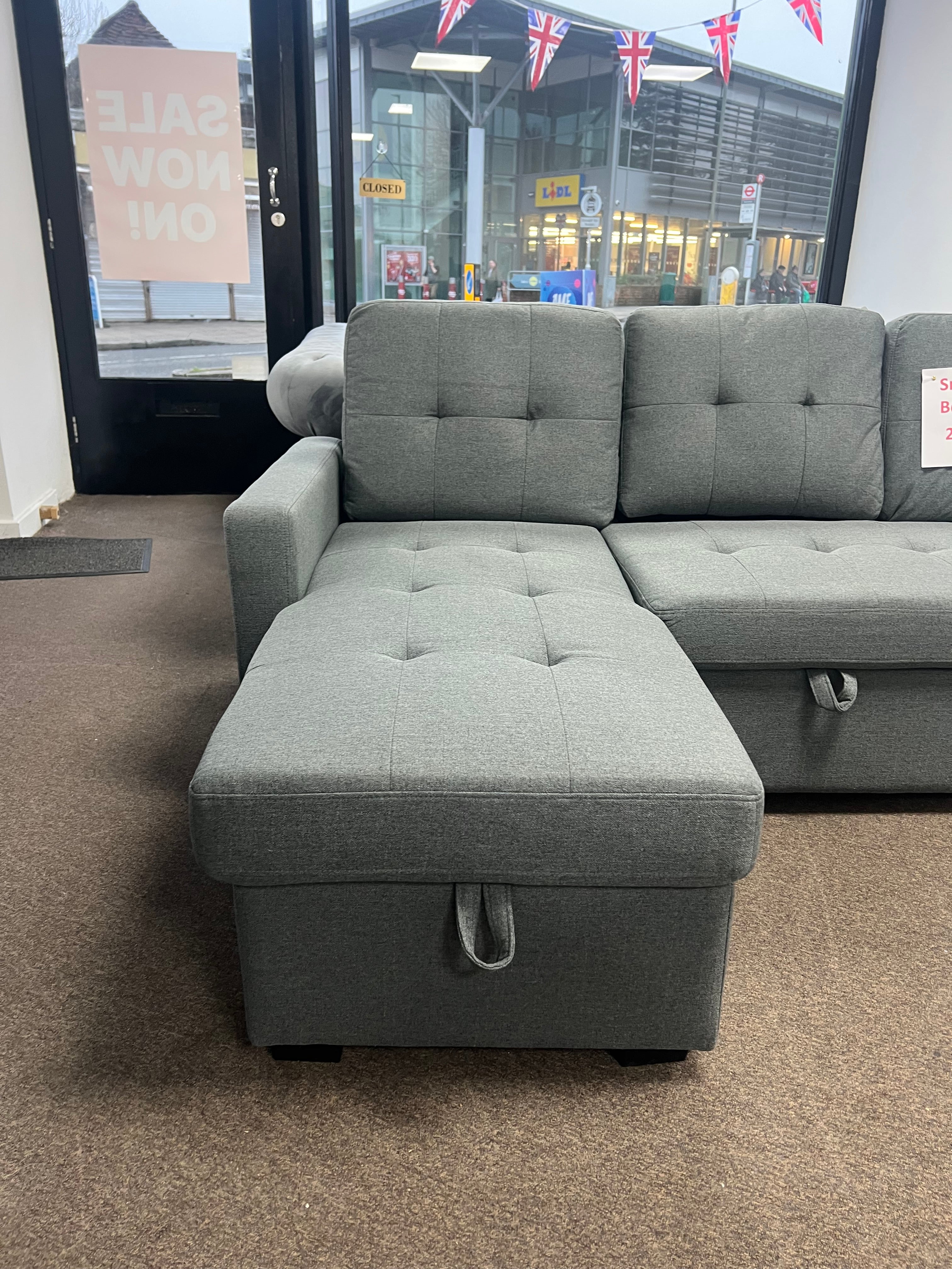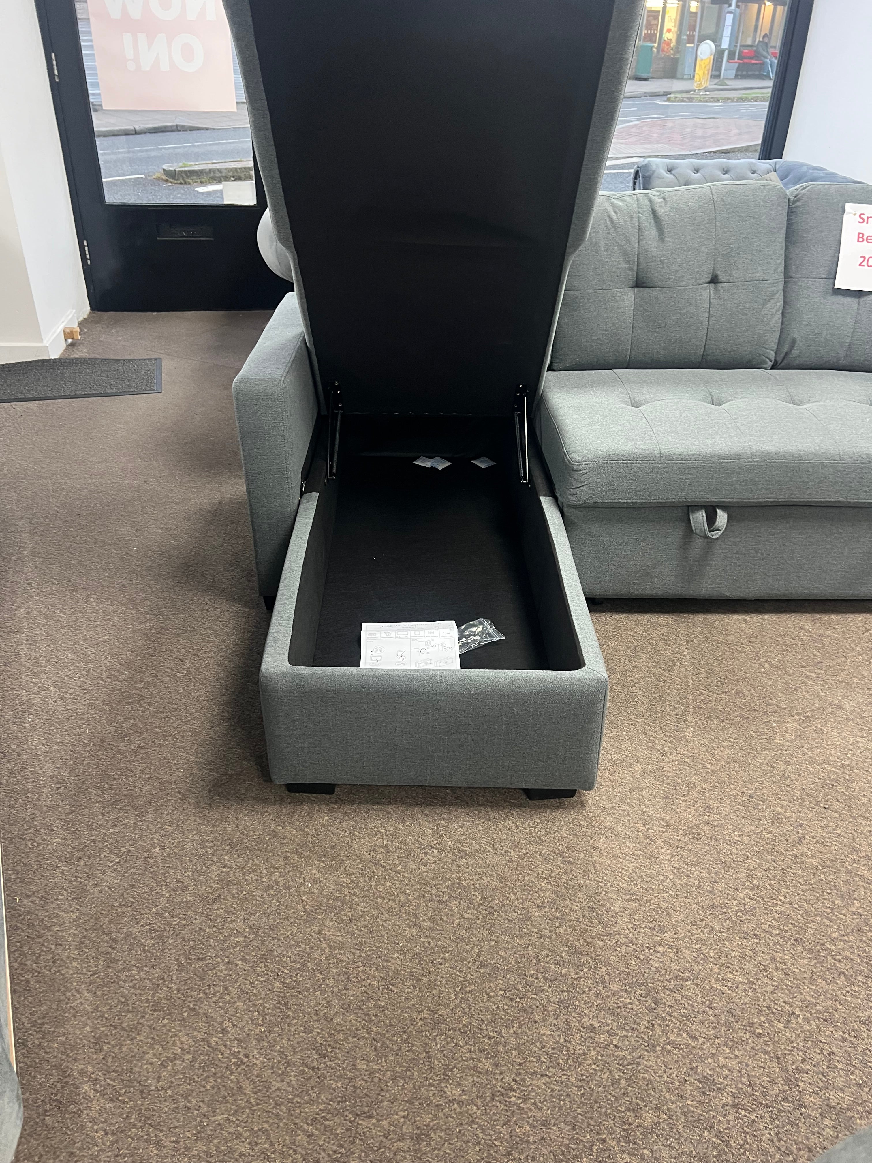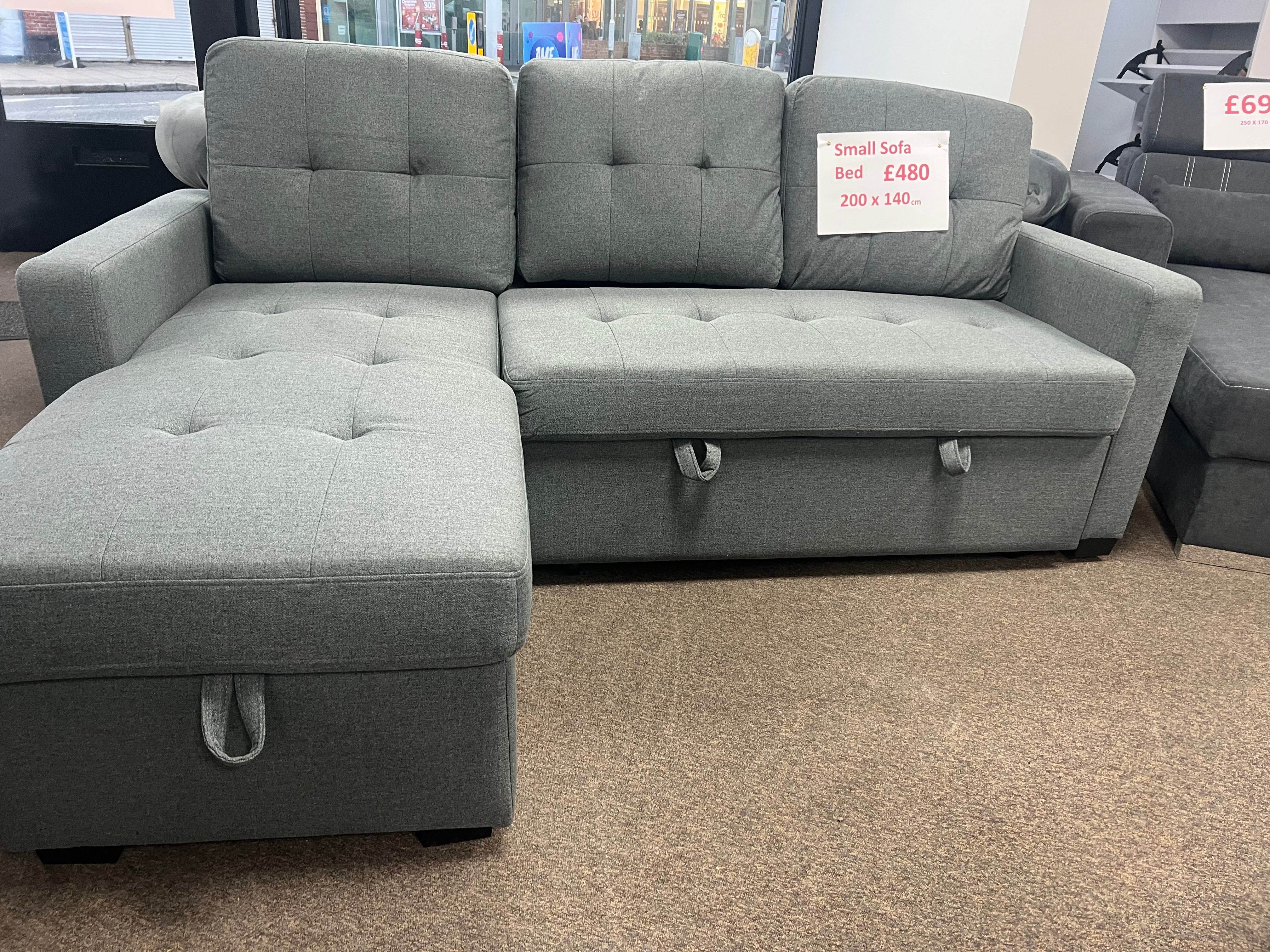 Small L shape sofa with storage converts into bed size 200x 140cm has storage underneath . It is universal can be fixed either side right or left arm pulls out convert into bed has storage underneath