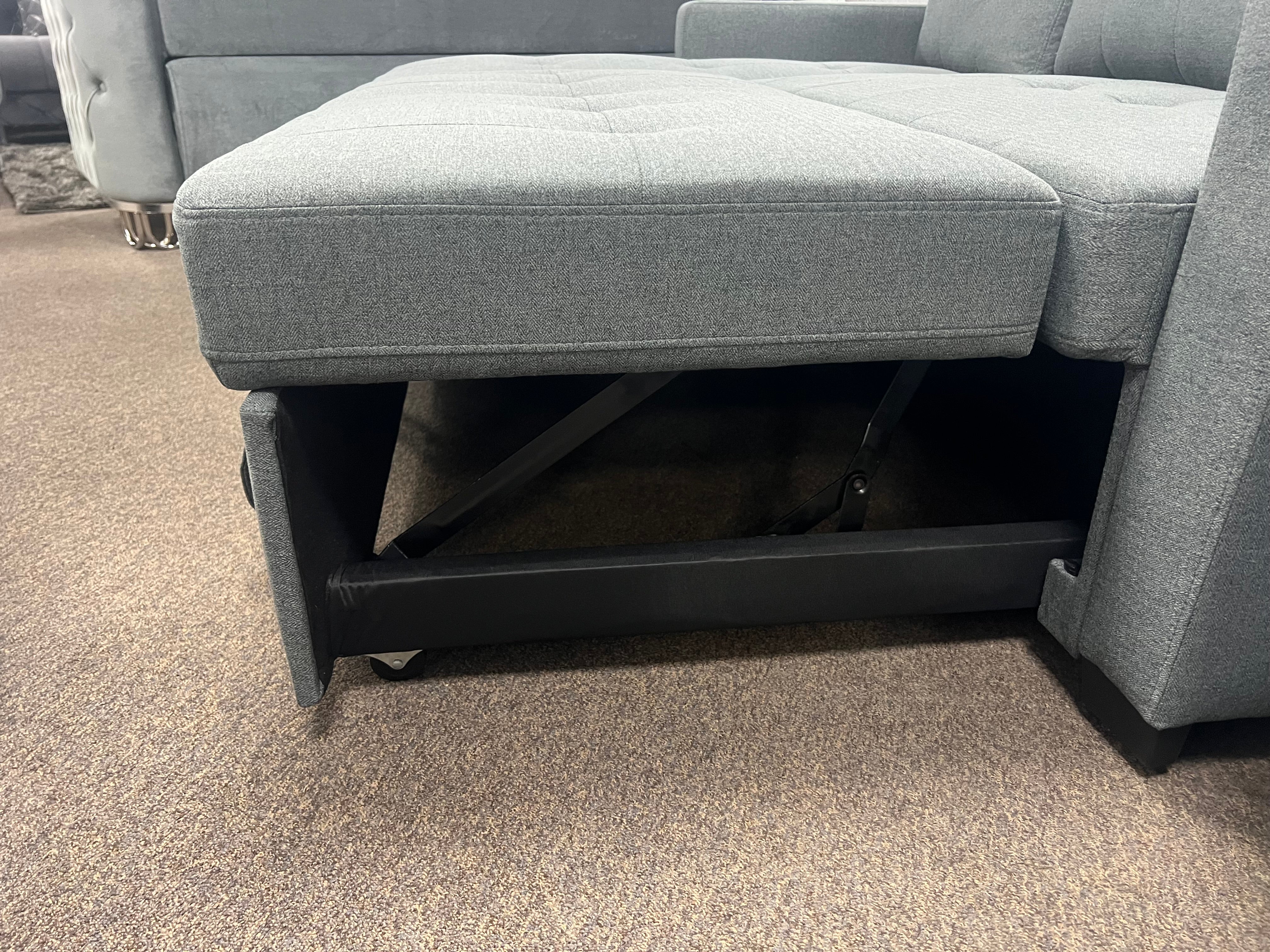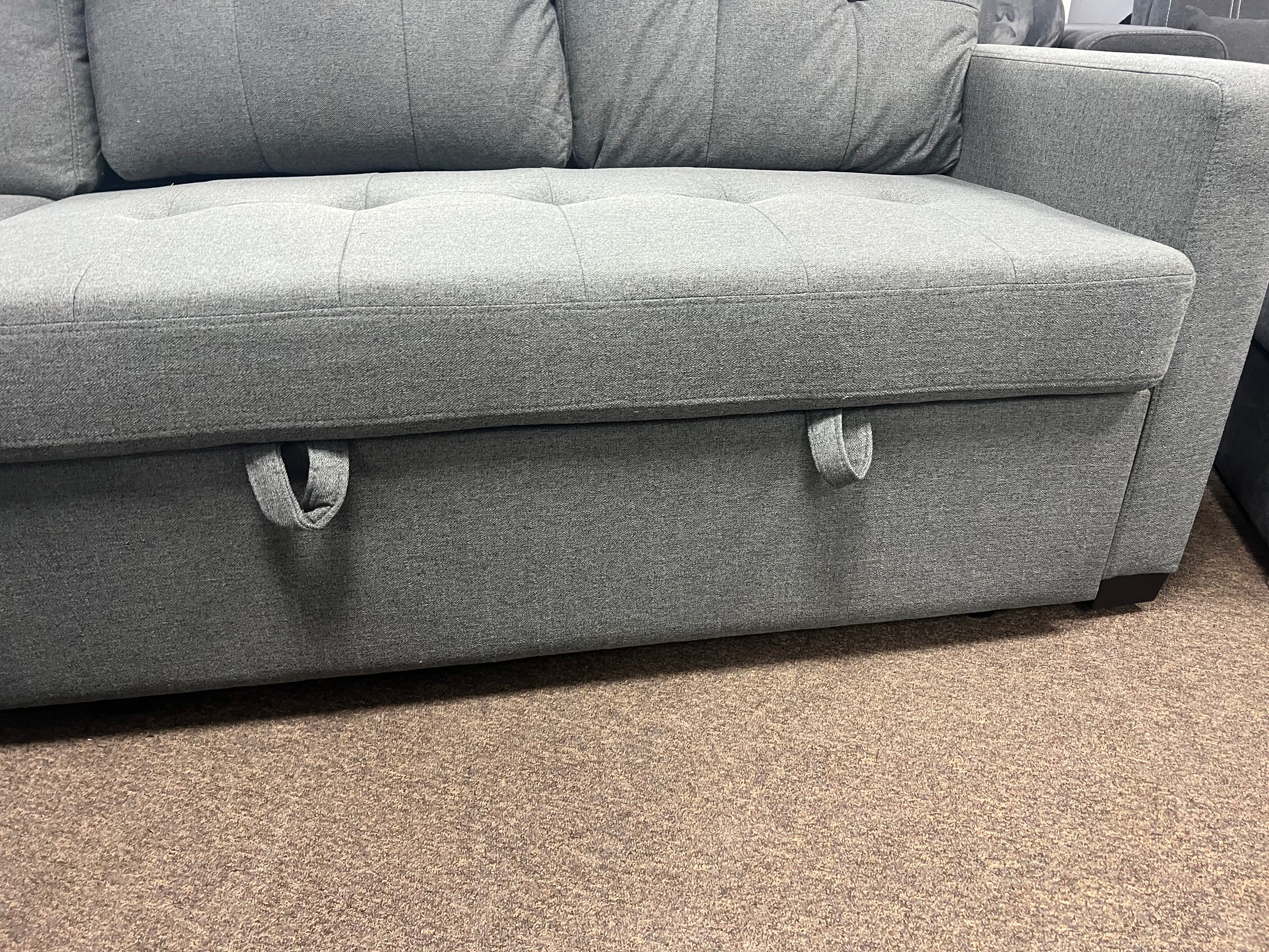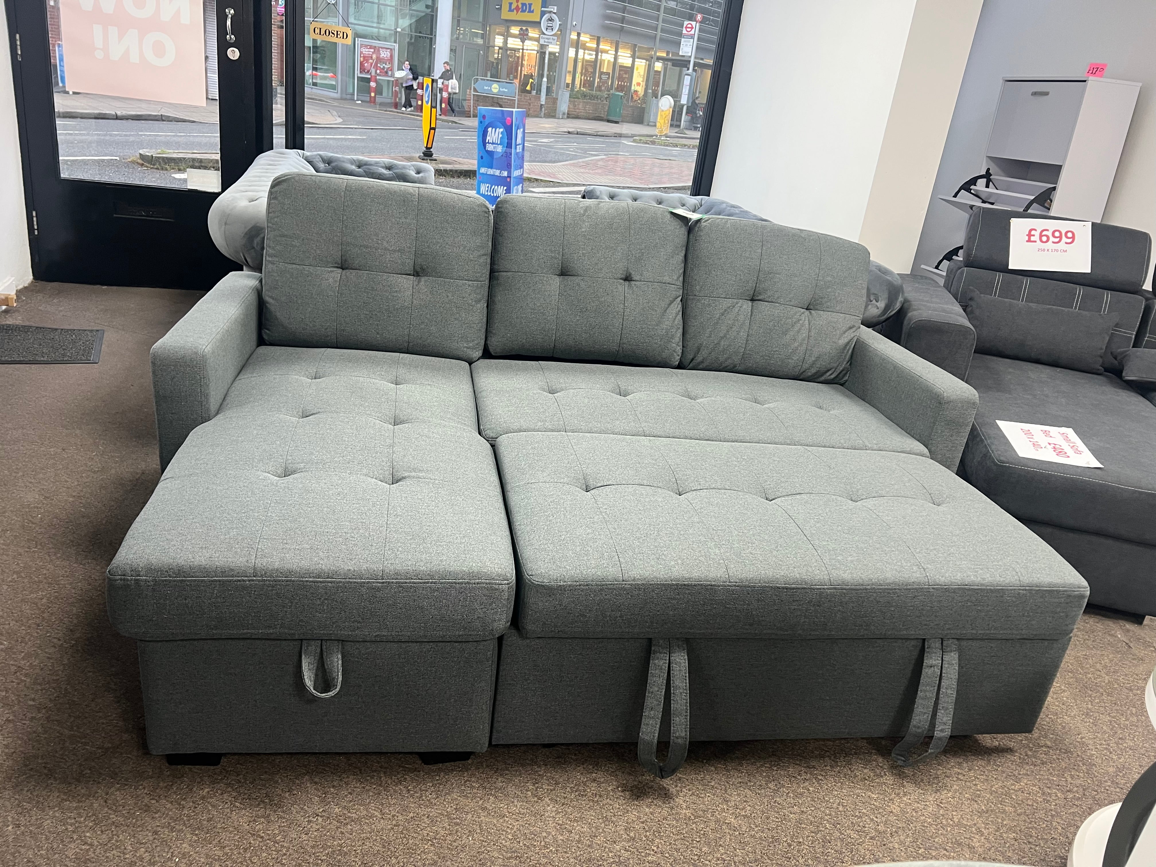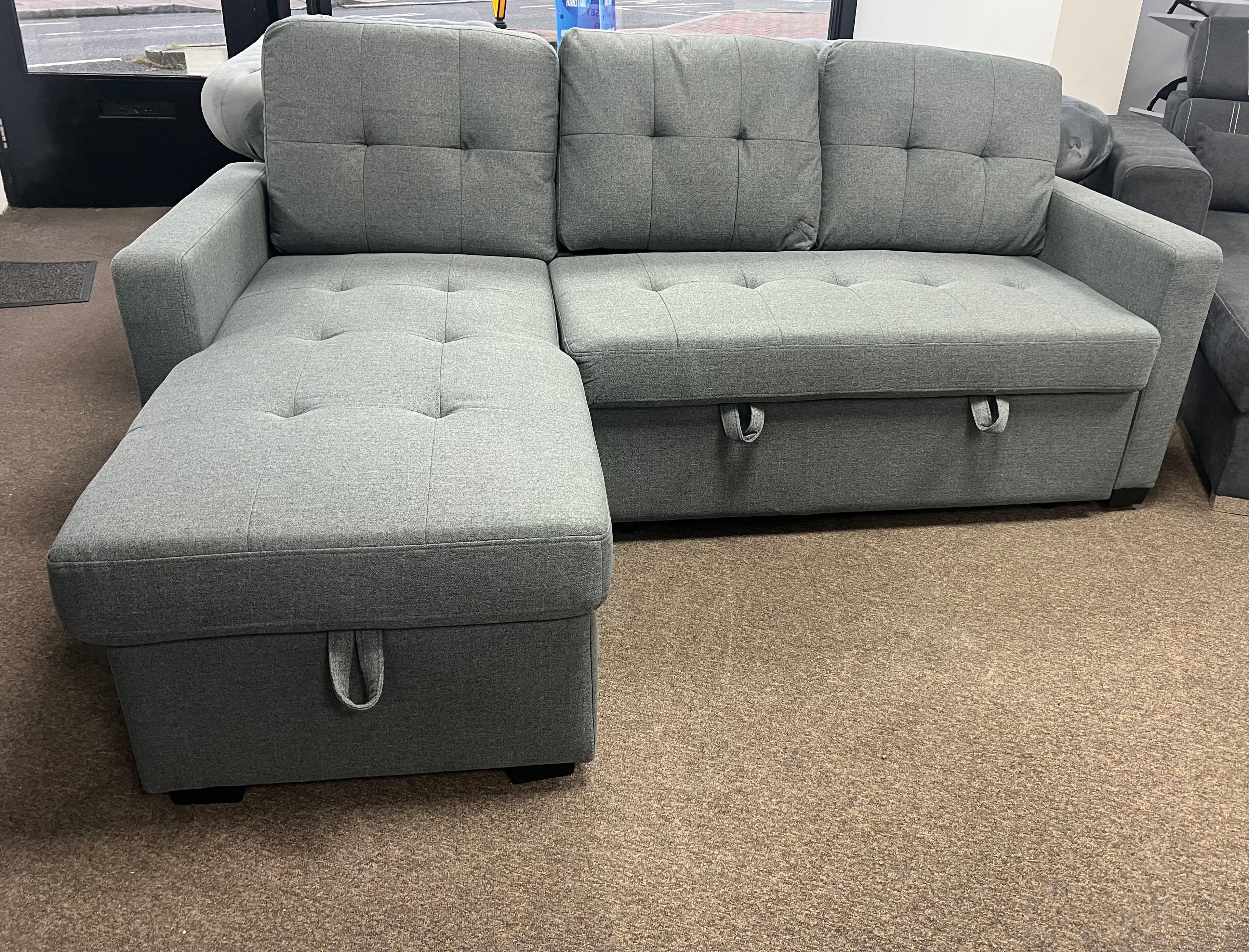 Small L shape sofa with storage converts into bed size 200x 140cm has storage underneath . It is universal can be fixed either side right or left arm pulls out convert into bed has storage underneath