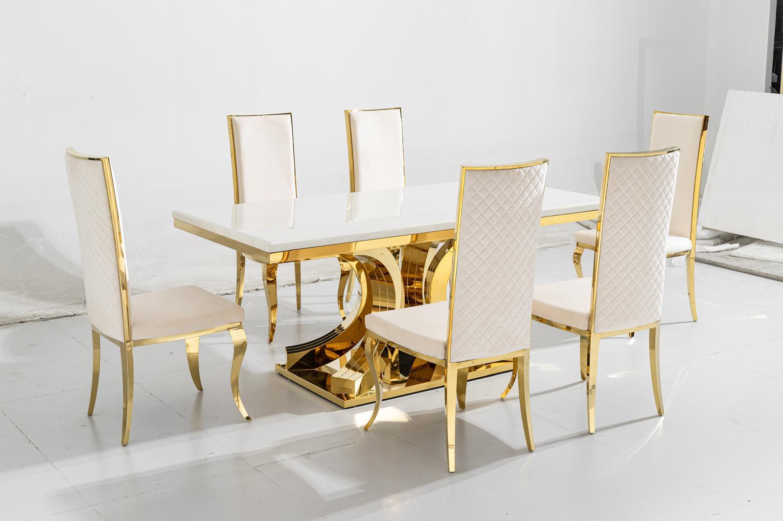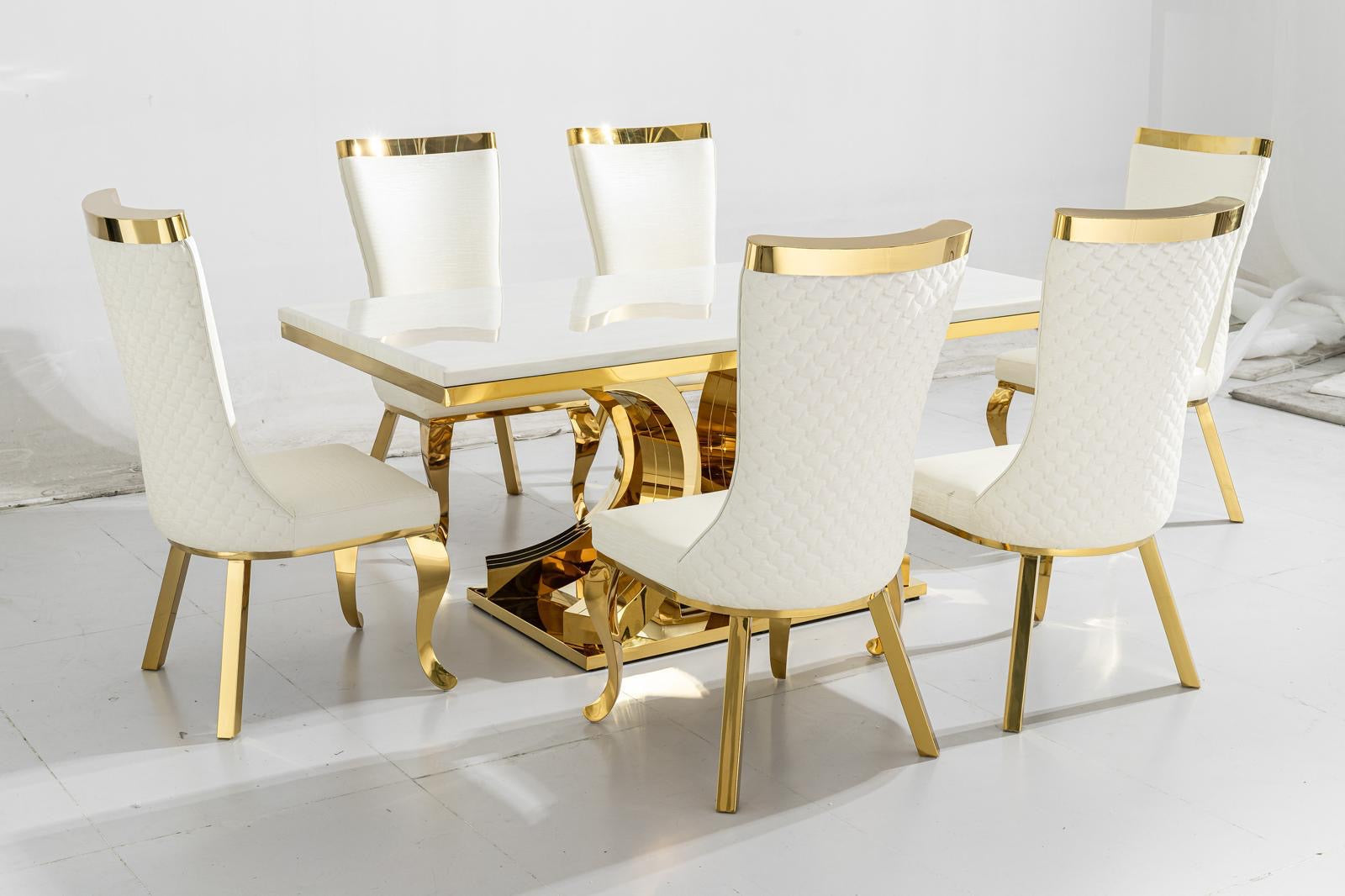 Upgrade your dining area with this exquisite Ash marble dining table. The steel bottom design chairs add a touch of elegance. The white and gold table top paired with a solid gold bottom ensures long-lasting quality. Enjoy a lifetime guarantee on this beautiful and durable set.